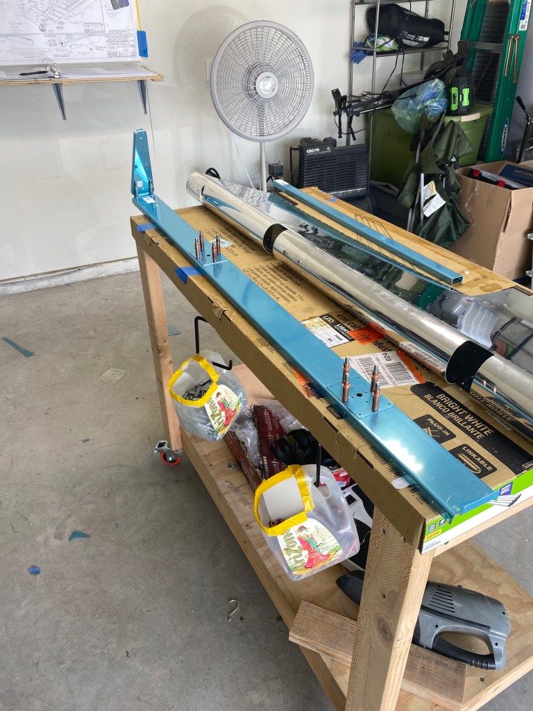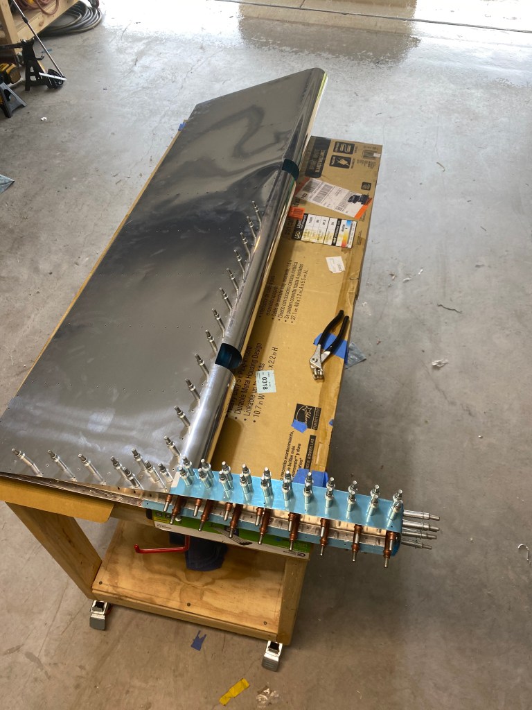 Once the skeleton is together, the skin can be clecoed and match drilled to the spar. Then the counterbalance arms are clecoed together, and those are added to the structure and match drilled.