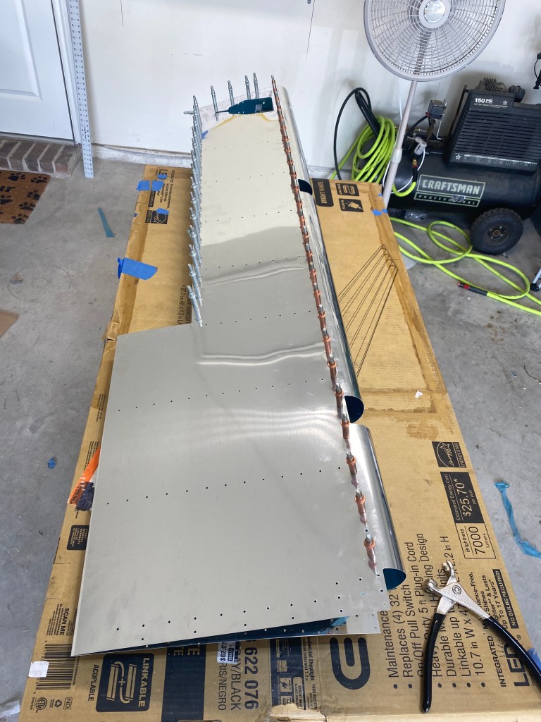 So far, the left and right elevators have been very similar. But now, there are some differences. This is because the trim tab is on the left elevator. The trim tab helps to relieve pressure on the control stick. This trim tab means some extra structure to support a hinge so that tab can move. So, instead of a continuous trailing edge, the left elevator has a small trailing edge, and then a channel where the hinge attaches the elevator to the trim tab. So like all other structure, the channel is clecoed and match drilled to the skin.