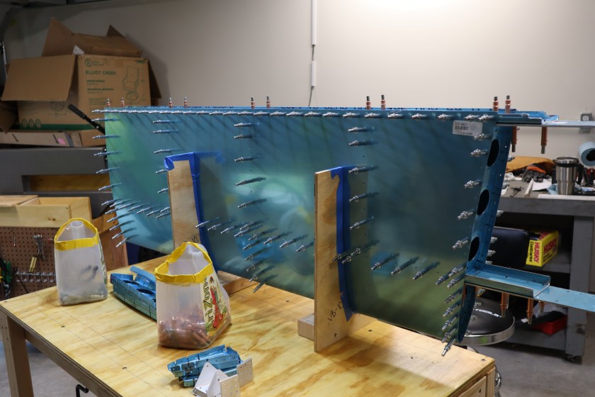 Just like before, the skin is then attached to the skeleton. After everything is clecoed together, the skin is match drilled to final size with the ribs and spars. Moments like this when an assembly is together is a very gratifying feeling. It’s a feeling of accomplishment and noticeable change. But this feeling is short lived, because you take it all apart and debur, dimple, and machine countersink the parts. Then it is ready for primer.