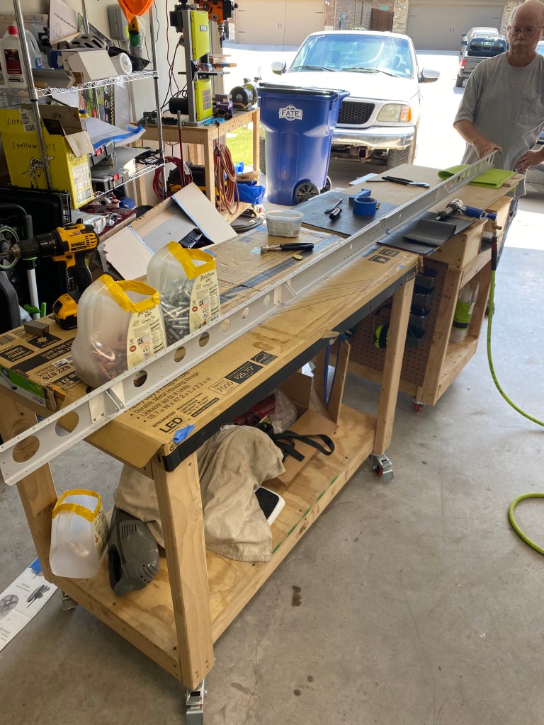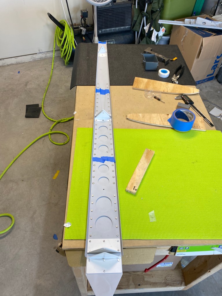 Next the skin was placed over this skeleton, and the skin was riveted to the ribs and front spar. Finally the rear spar was riveted to the ribs and skin. This completed the first major component of the airplane build.