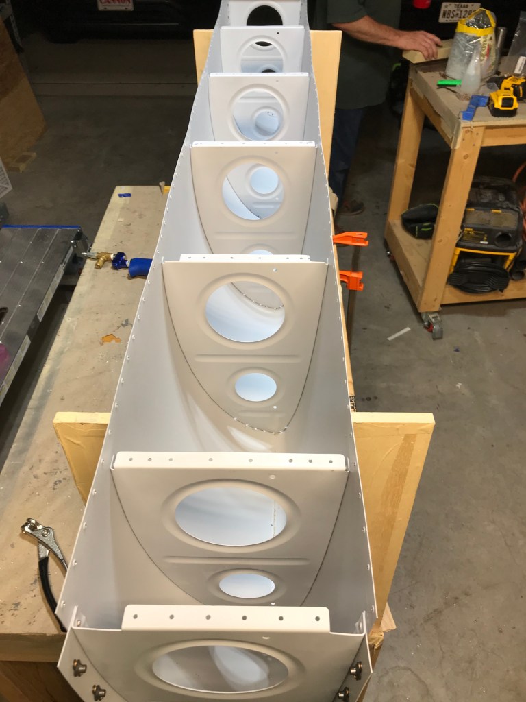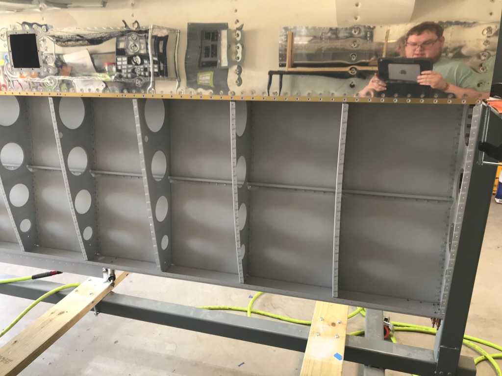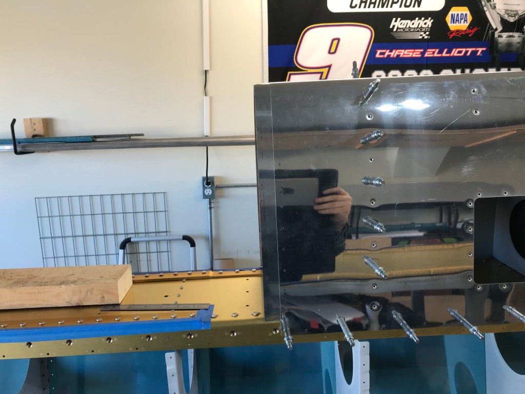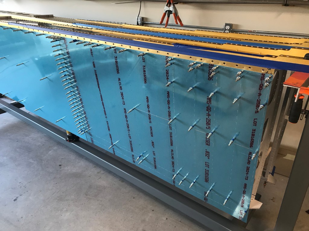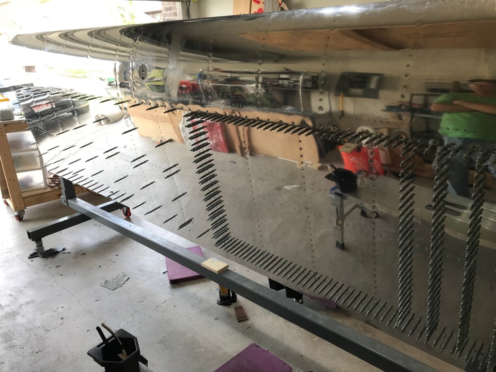 We started close to the middle and worked our way to the outsides. Once both the inboard and outboard skins were attached, a J stiffener was added down the middle. This helps to add stiffness to the structure. Finally, the top skin was completely riveted to the structure. This was a big moment. I was also surprised how rigid the structure was.