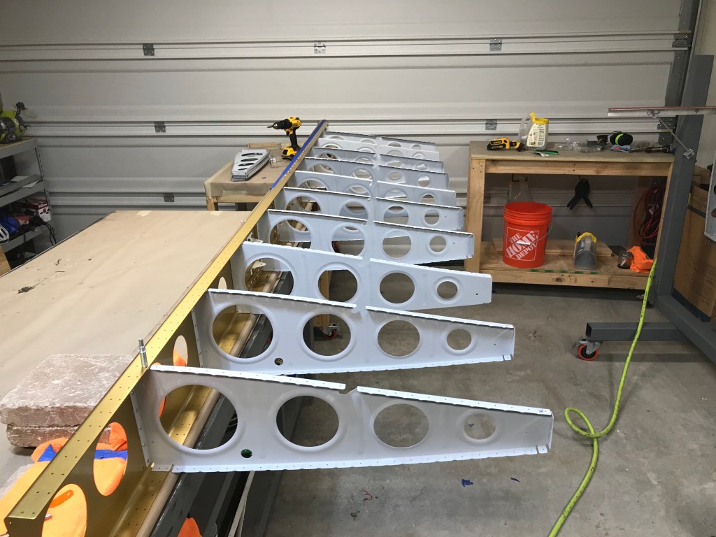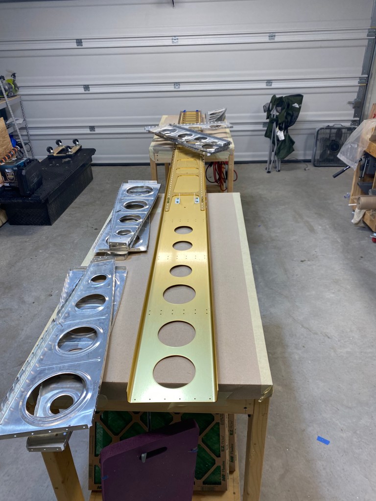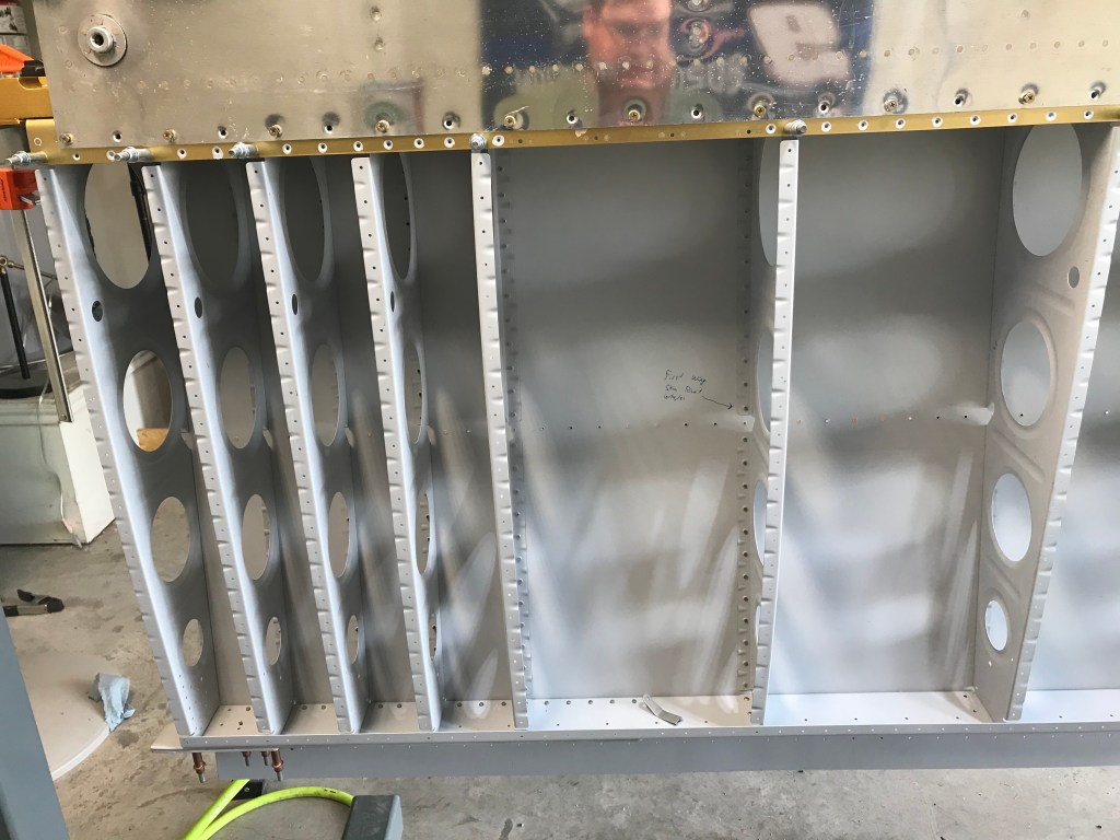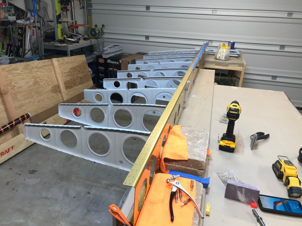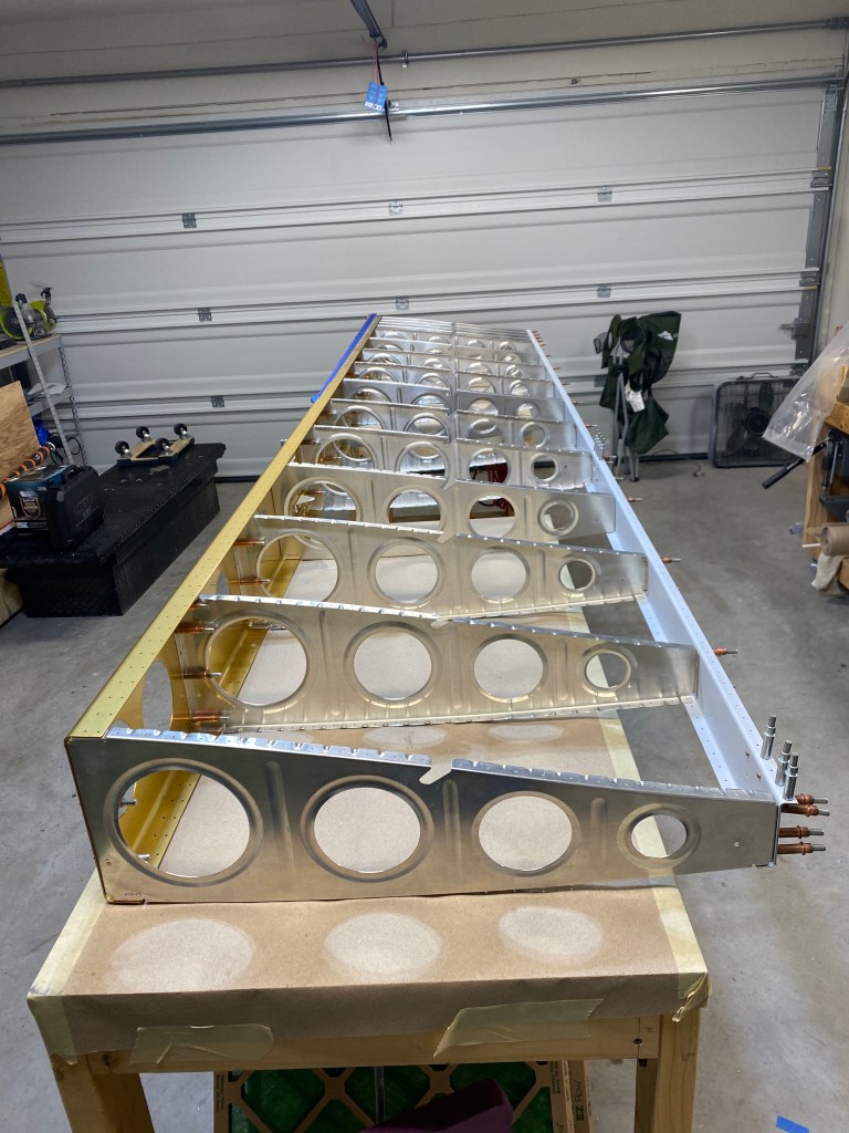 We started close to the middle and worked our way to the outsides. Once both the inboard and outboard skins were attached, a J stiffener was added down the middle. This helps to add stiffness to the structure. Finally, the top skin was completely riveted to the structure. This was a big moment. I was also surprised how rigid the structure was.